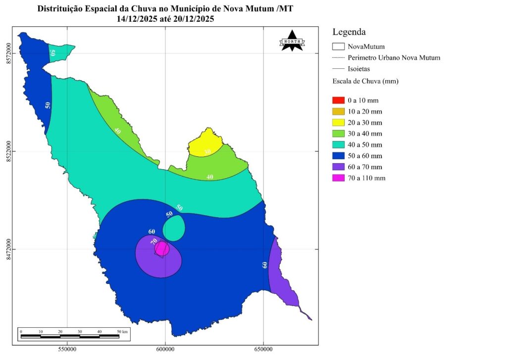 Na região centro-leste, próxima ao limite com Lucas do Rio Verde, os acumulados semanais foram mais modestos e não ultrapassaram 40 mm. Ainda assim, esse volume é considerado favorável para a atividade agrícola, pois corresponde a uma média aproximada de 5,7 mm por dia, suficiente para a manutenção da umidade do solo e atendimento da demanda hídrica das culturas.