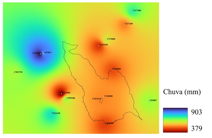 Este estudo utilizou dados horários de precipitação provenientes de 15 estações pluviométricas da Rede Hidrometeorológica Nacional (Hidrotelemetria), além da Estação Meteorológica Automática da UNEMAT, campus de Nova Mutum. Embora o município de Nova Mutum e seu entorno contem com 25 estações cadastradas no sistema Hidrotelemetria, parte delas apresentou inconsistências nos registros ou lacunas de dados ao longo do período analisado, motivo pelo qual foram excluídas da análise. A Figura a seguir ilustra a distribuição espacial da chuva total acumulada ao longo das 15 semanas de monitoramento na região, correspondentes a 105 dias de observação, e a localização das estações utilizadas.