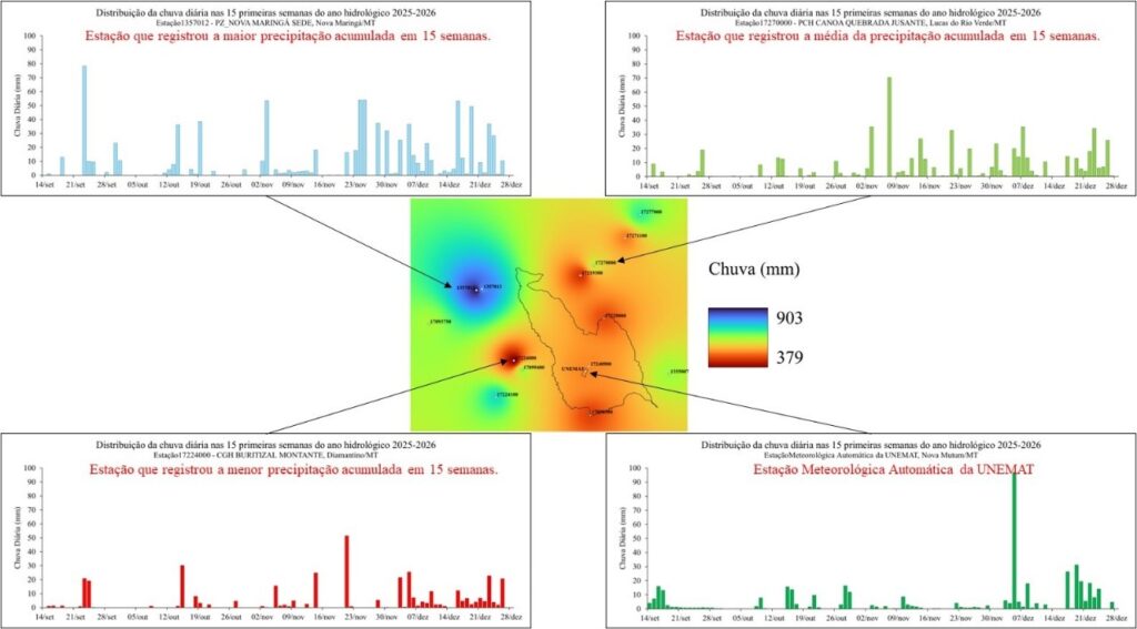 A análise da Figura indica que o município de Nova Mutum apresentou acumulados de precipitação próximos à média regional. Para melhor caracterização desse comportamento, apresenta-se, de forma gráfica, a distribuição da chuva diária das seguintes estações: aquela com o maior acumulado no período, a que registrou o menor acumulado, a estação com precipitação mais próxima da média regional (menor desvio em relação à média) e a Estação Meteorológica da UNEMAT.
