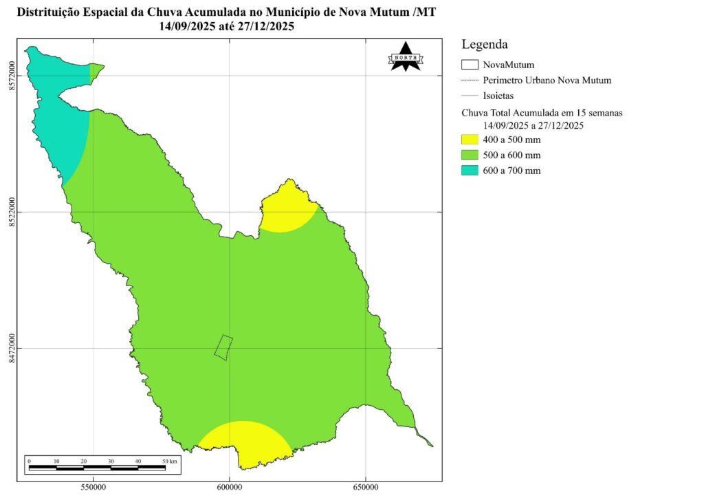 Pela análise da Figura, observa-se que a região do Pontal do Marapé, no extremo noroeste do município, concentrou os maiores acumulados de precipitação, variando entre 600 e 700 mm. Em contraste, os menores volumes ocorreram no extremo sul, próximo aos limites com os municípios de Nobres e Diamantino, bem como na região centro-nordeste, nas proximidades das divisas com Lucas do Rio Verde e Sorriso, onde os totais ficaram entre 400 e 500 mm. Nas demais áreas do município, que correspondem à maior parte do território, a chuva acumulada situou-se predominantemente na faixa de 500 a 600 mm.