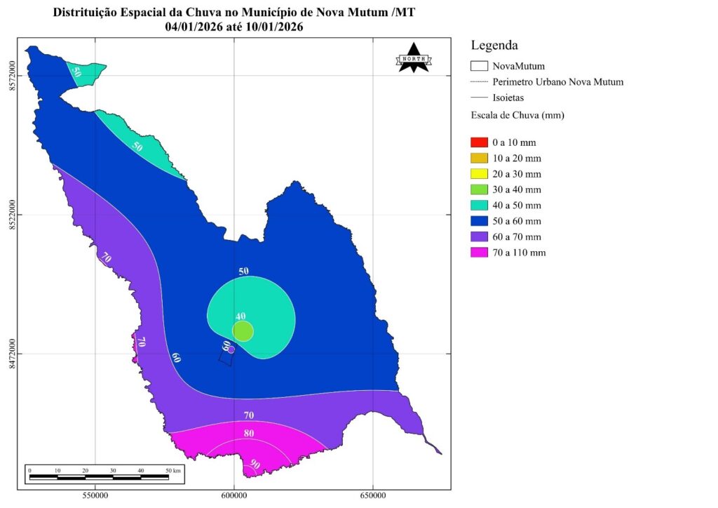 O monitoramento realizado pela Equipe de Hidrometeorologia do Curso de Agronomia da UNEMAT (campus de Nova Mutum) indica que os volumes de chuva no município de Nova Mutum variam entre 40 e 90 mm, na décima sétima de monitoramento.