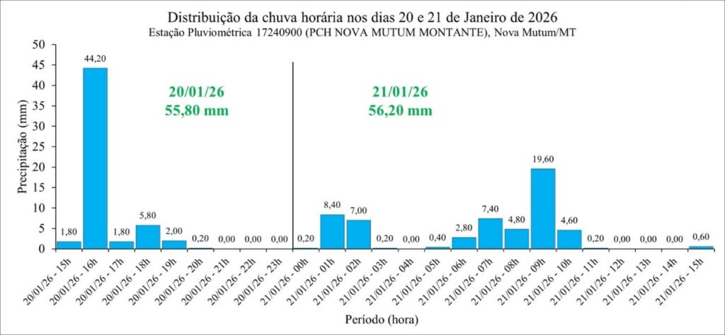 Na figura abaixo apresenta-se a dinâmica da precipitação registrada nos dias 20 e 21 de janeiro, cuja soma totalizou 112 mm. No dia 20, a chuva teve início às 15 h e se estendeu até as 20 h, totalizando cerca de 6 h de duração, com destaque para um pico de intensidade de 44,20 mm na segunda hora do evento.