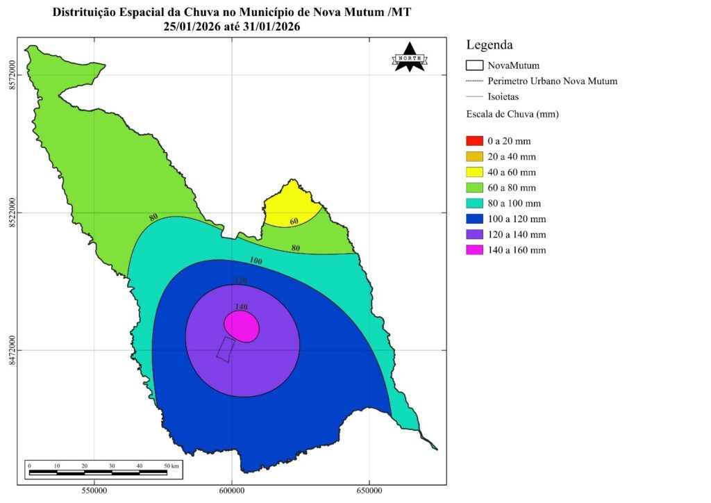 Os volumes mais elevados foram registrados nas proximidades do perímetro urbano de Nova Mutum, onde as isoietas indicam totais entre 140 e 160 mm, configurando o núcleo de máxima precipitação da semana. A partir dessa região, os acumulados decrescem gradualmente para as bordas do município, com faixas entre 120, 100 e 80 mm se estendendo para sul e sudeste. Já as áreas mais ao norte e noroeste apresentaram os menores registros, variando entre 40 e 60 mm. Mesmo sendo os menores valores do período, esses volumes ainda representam cerca de 7 mm diários, índice considerado satisfatório para a manutenção da umidade do solo e das culturas em campo.