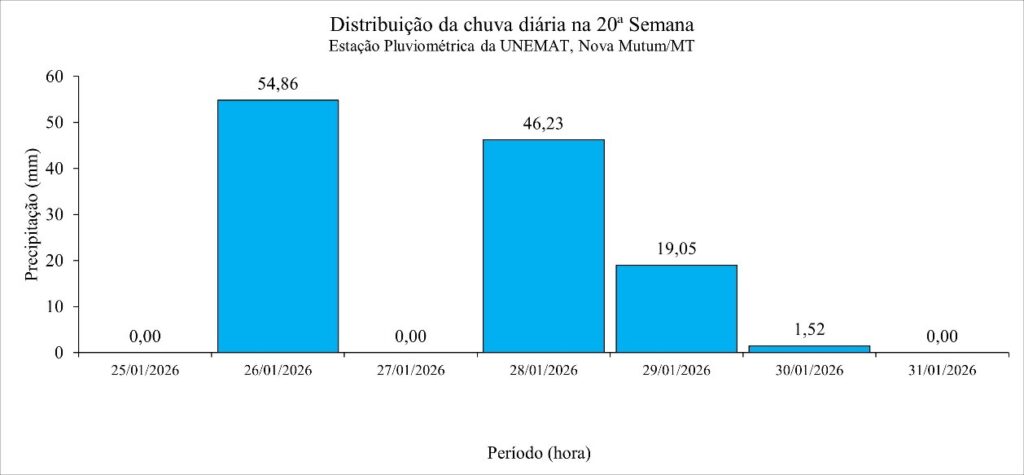 A estação pluviométrica da UNEMAT, campus de Nova Mutum, registrou acumulado semanal de 121,66 mm durante a 20ª semana de monitoramento, com ocorrência de chuva em quatro dos sete dias avaliados. A distribuição temporal foi irregular, com precipitações concentradas em poucos dias e intervalos de estiagem entre eles.