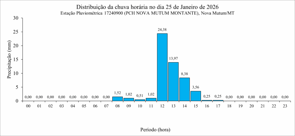 A partir das 12h00, contudo, o evento ganhou intensidade, configurando o núcleo principal da tempestade. Nesse intervalo foi observado um acumulado horário de 24,38 mm, seguido de redução gradual da intensidade até as 15h00, quando ainda se registraram 3,56 mm. Nas horas finais ocorreram apenas precipitações residuais, da ordem de 0,25 mm por hora, encerrando o evento na forma de chuvisco. Esse segundo bloco concentrou a maior parte do volume diário e foi o principal responsável pelo total de 54,86 mm registrado no dia.